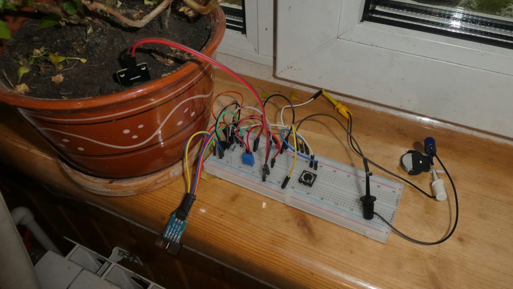 Чтобы порог влажно/сухо не был жестко запрограммирован в коде (это сильно зависит от состава почвы), в цепь последовательно с щупом добавлен потенциометр на 500к. Сопротивление щупа в насыщенной водой земле около 5к-20к, в нормальной земле 50к-150к, в подсыхающей земле — 150к-300к, в сухой земле — от 500к до нескольких мегаом. В коде указан предел сопротивления, при котором почва уже не считается влажной, по умолчанию 500к (#define THRESHOLD_PROBE 500). Таким образом, подкручивая потенциометр, можно настраивать оповещение на более ранее срабатывание сигнала, когда почва еще не совсем пересохла.