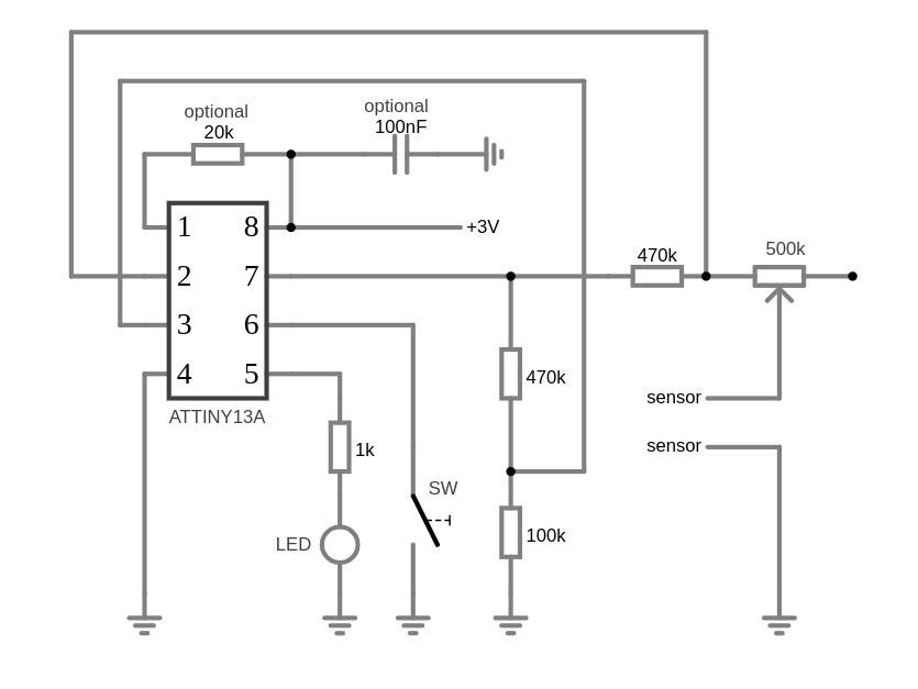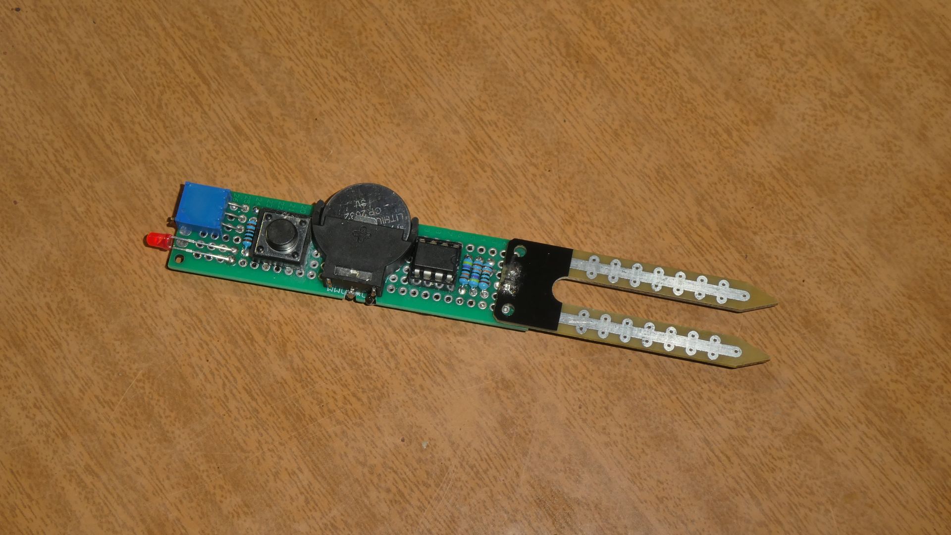 В зависимости о типа корпуса и заказываемого количества, один микроконтроллер ATTINY13A обойдется в 40-60 рублей, что недорого для его функционала. К примеру, голый классический ардуинный ATMEGA328P продают по цене от 140 рублей, что тоже недорого, но его возможности, да и размеры, для данного проекта избыточны. Мне показалось интересным вызовом использовать именно ATTINY13A по-максимуму, поэтому я заказал именно его. Китайские щупы для почвы стоят 40-50 рублей вместе с модулем компаратора LM393, который нам в этом проекте не пригодится, но компаратор всегда можно куда-то пристроить. Вообще, говорят, что эти щупы недолговечны, поэтому можно сэкономить и на них, заменив их двумя штырями из нержавейки, а еще лучше — из графита (их можно вынуть из севших солевых батареек АА). Остальные компоненты — светодиод, кнопка и резисторы — копейки, и они наверняка уже есть у тех, кто хоть немного занимается электроникой. Потенциометр можно не ставить, если заранее определите сопротивление сухой почвы и пропишите это значение в коде (в этом случае для перенастройки на другую почву может потребоваться перепрошивать прибор, поэтому на потенциометре лучше не экономить — можно ставить любой в разумных пределах, например от 200к до 1М). Плата для сборки — на свое усмотрение — схема простая, при желании можно и на куске тонкого пластика собрать 🙂 Я давно покупал набор из дырявых плат разных размеров, и по необходимости беру из того запаса, вот и сейчас плата 80x20mm пошла в дело. Конденсатор можно не ставить (будет нормально работать и без него, но считается хорошим тоном его ставить для фильтрации высокочастотных шумов и сглаживания пульсаций). Резистор 20к на RESET обычно ставят, но я проверил свой образец, и там стабильное VCC, то есть по ощущению микроконтроллер использует внутренний подтягивающий резистор, если пин 1 выполняет функцию ресета. На микросхемах, где это не так, на этом пине можно наблюдать какое-то непонятное напряжение, в таких случаях внешний подтягивающий резистор действительно необходим. Тут надо учитывать, что резисторы — это потребители энергии, пусть и небольшой. При питании от блока питания это не принципиально, но при питании от CR2032 нужно стараться избавляться от всего лишнего, без чего прибор может работать.