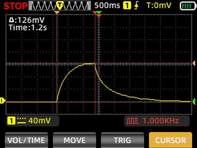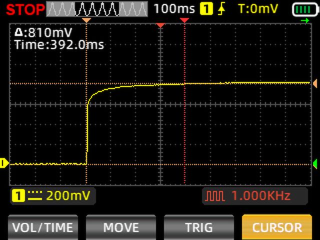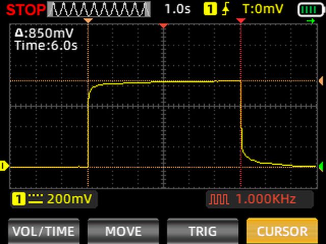 На осциллограмме видим, что за 6 секунд замера напряжение стабилизировалось на отметке 850 милливольт. Давайте замерим, за какое время можно измерить сопротивление этой почвы с некоторой погрешностью:
